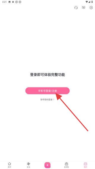 2、进入我的页面后,在登录即可体验完整功能下,点击粉色按钮手机号码登录/注册。