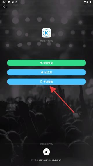1、启动酷狗音乐App,在登录选择界面中,点击手机登录按钮。