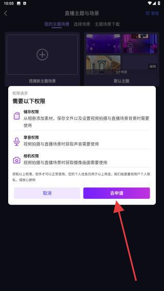 3、弹出储存/录音/相机权限申请,点击去申请并授予所有权限,完成主题加载。