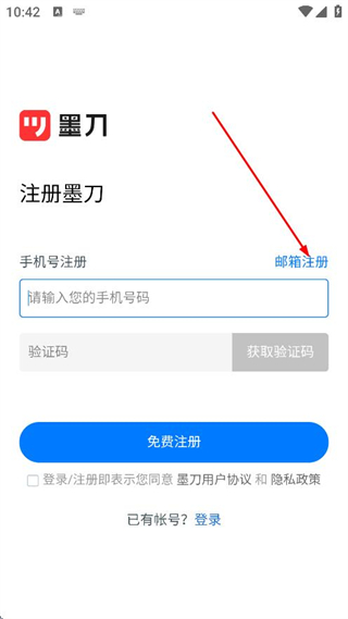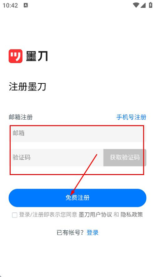 3、输入邮箱,获取验证码后点击免费注册,完成账号注册操作。