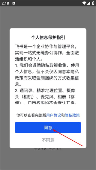 1、在飞书的个人信息保护指引弹窗中,点击同意,进入飞书的登录页面。
