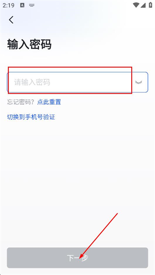 2、在登录页面,填写完整手机号码,点击下一步按钮,进入密码输入页面。