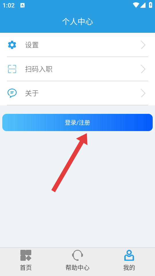 1、进入个人中心的页面,我们需要先点击蓝色的登录/注册按钮,开启账号的登录或注册流程。