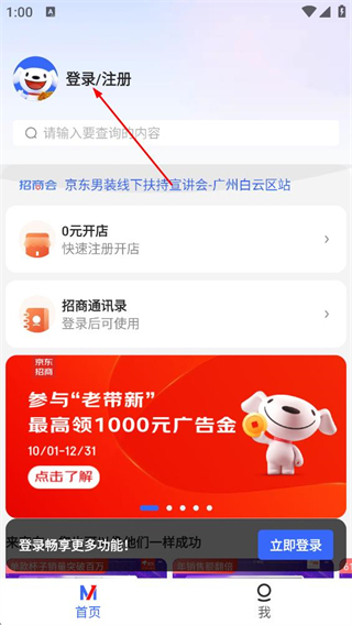 2、在京麦首页,点击顶部的登录/注册选项,进入0元开店相关页面。