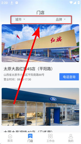 2、在门店页面顶部,通过城市、品牌筛选栏选择目标城市和品牌,筛选出对应店铺。