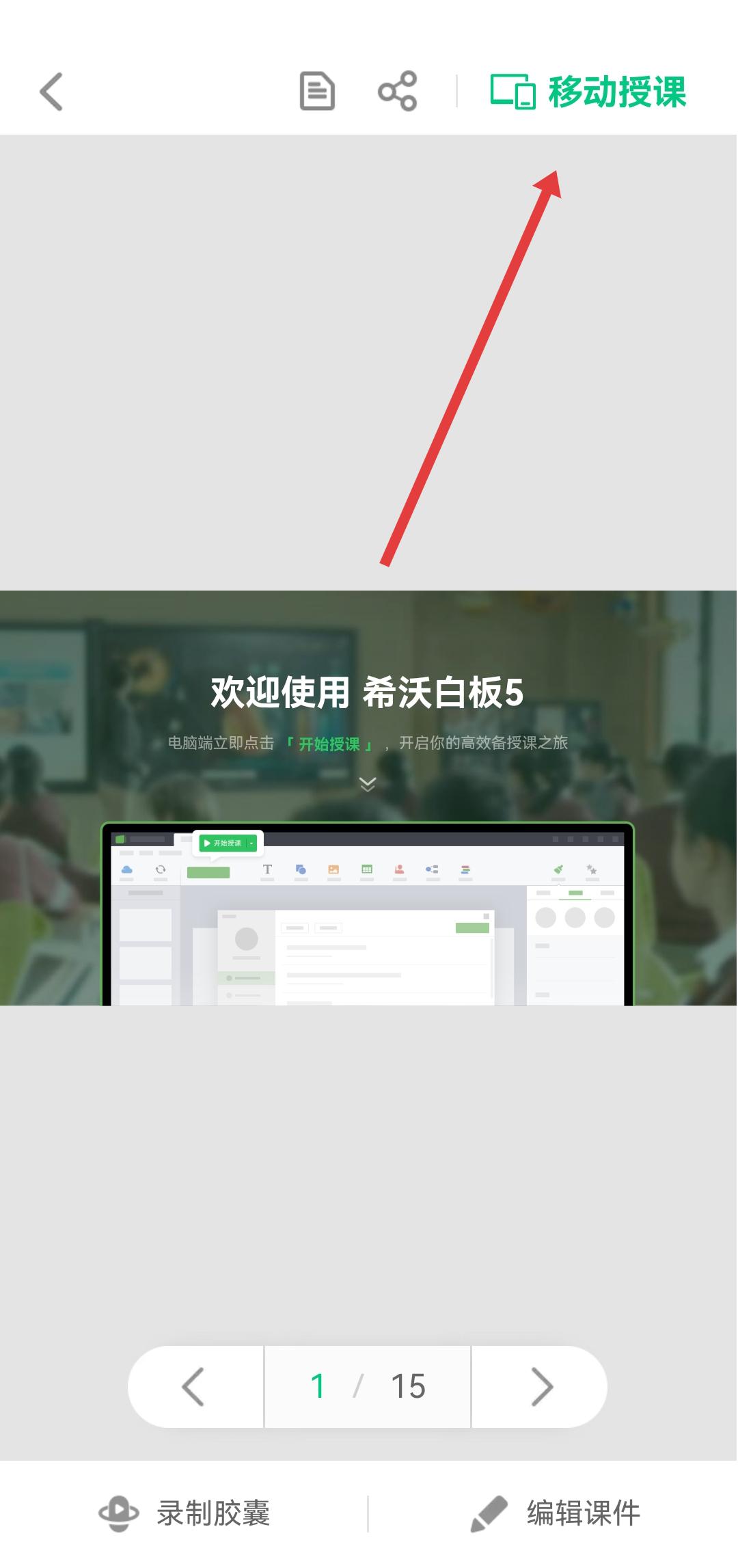 2、进入课件的详情页后,我们这里需要点击右上角的移动授课按钮。