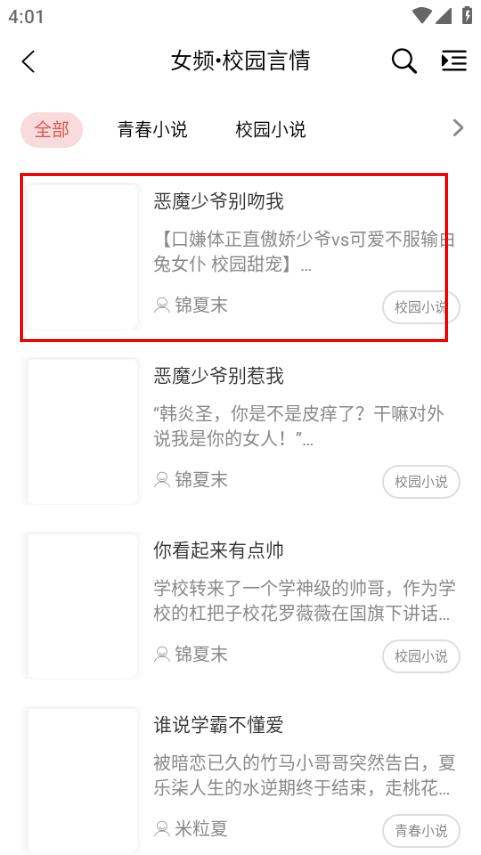 3、在女频校园言情页面,点击恶魔少爷别吻我,进入该书详情页面。