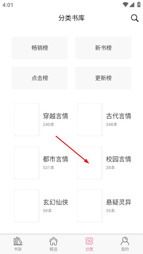 2、在分类书库页面,点击校园言情,进入女频校园言情页面。