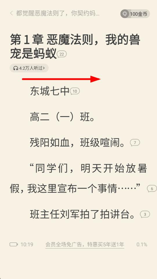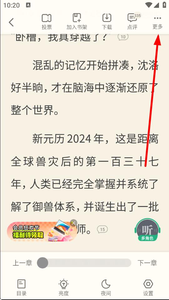2、进入虫族天灾的阅读页面后,开始阅读小说内容,当读到想要标记的位置时,点击屏幕上方的更多选项,打开更多操作菜单。