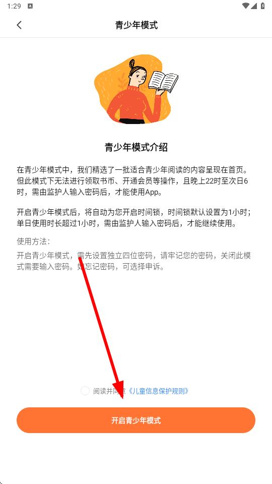 2、进入青少年模式介绍界面,阅读相关介绍后,勾选同意儿童信息保护规则,再点击开启青少年模式按钮。