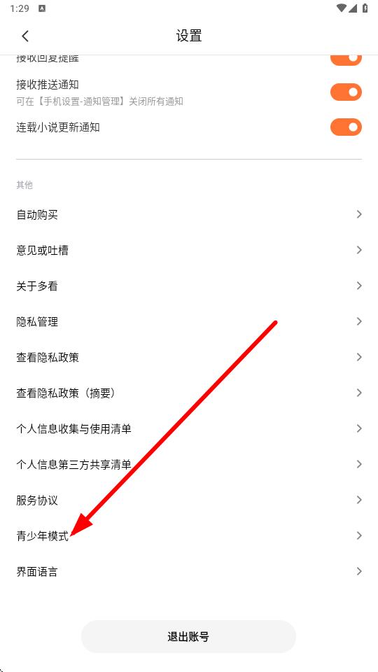 1、打开多看阅读App进入设置页面,在设置选项中找到并点击青少年模式。