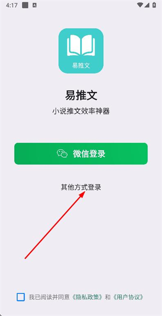 1、在易推文登录页勾选协议后,点击其他方式登录选项,弹出登录方式选择弹窗。