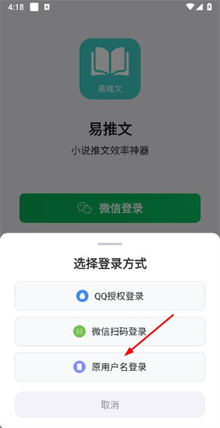 2、在登录方式选择弹窗中点击原用户名登录选项,进入用户名登录页面。
