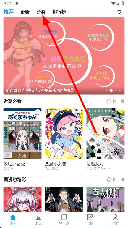 1、打开再漫画APP,进入主界面,点击顶部分类选项。