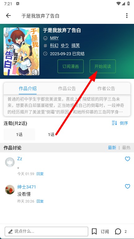 4、进入漫画详情页面,查看作品更新进度、章节列表,点击开始阅读。