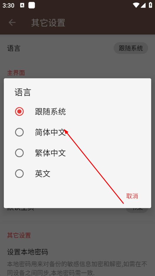 4、在弹出的语言选择窗口中,点击简体中文选项,即可将阅读App的语言设置为中文。