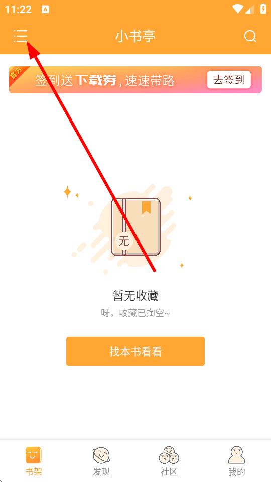 1、打开小书亭应用,在书架界面点击左上角三条横线图标,打开侧边栏菜单。