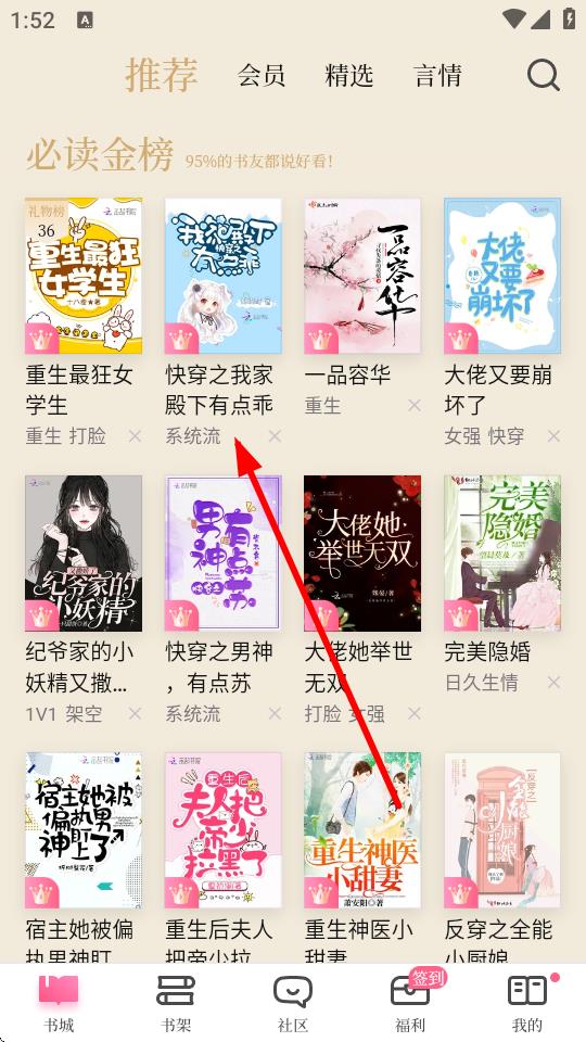 1、打开红袖读书App,在书城的必读金榜中找到并点击快穿之我家殿下有点乖这本小说。