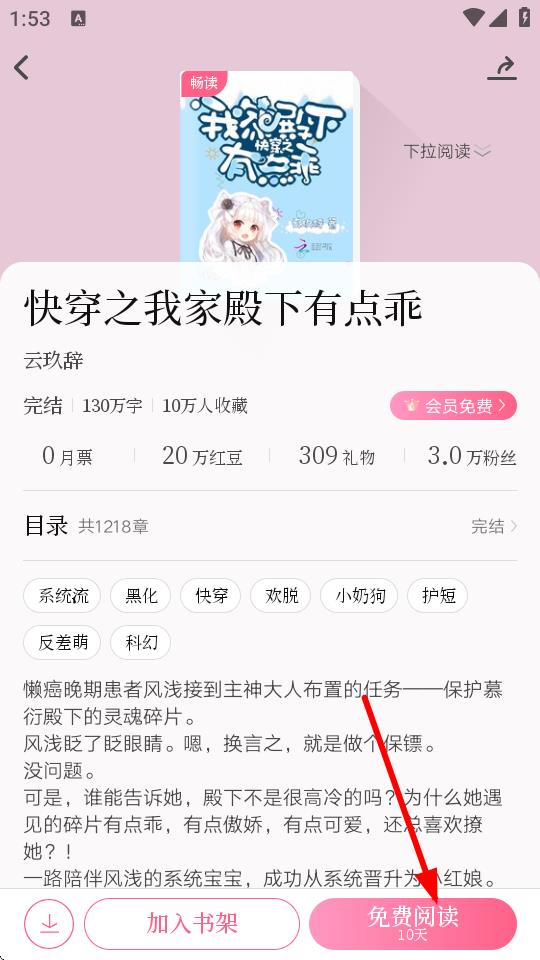 2、进入小说详情页后,点击页面下方的免费阅读按钮,即可开始阅读小说。