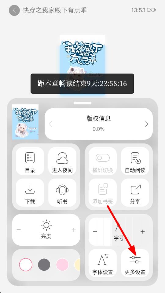 3、在小说阅读界面点击屏幕,唤出设置菜单,然后点击更多设置选项。