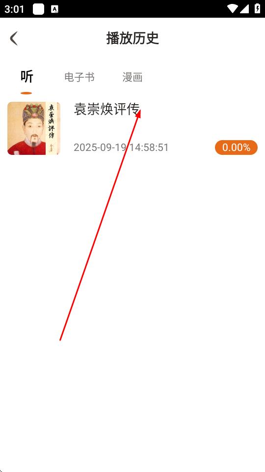 3、在“播放历史”页面,长按想要删除的听书记录,比如袁崇焕评传。