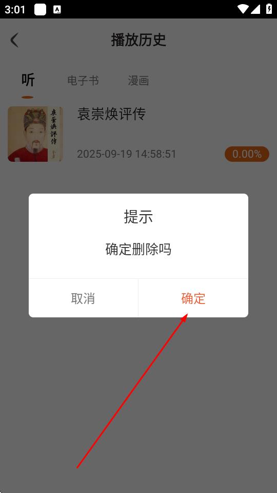 4、在弹出的提示-确定删除吗对话框中,点击确定按钮,即可删除该听书记录。