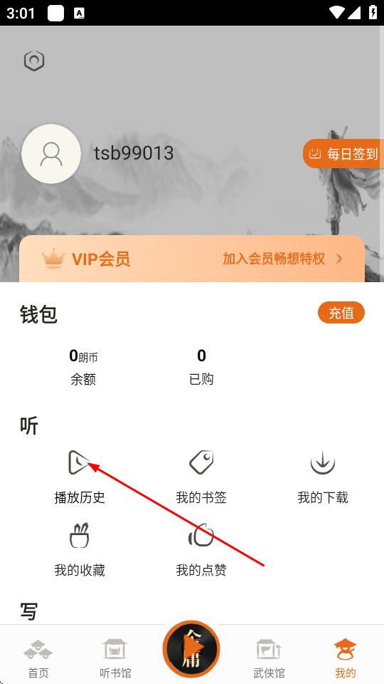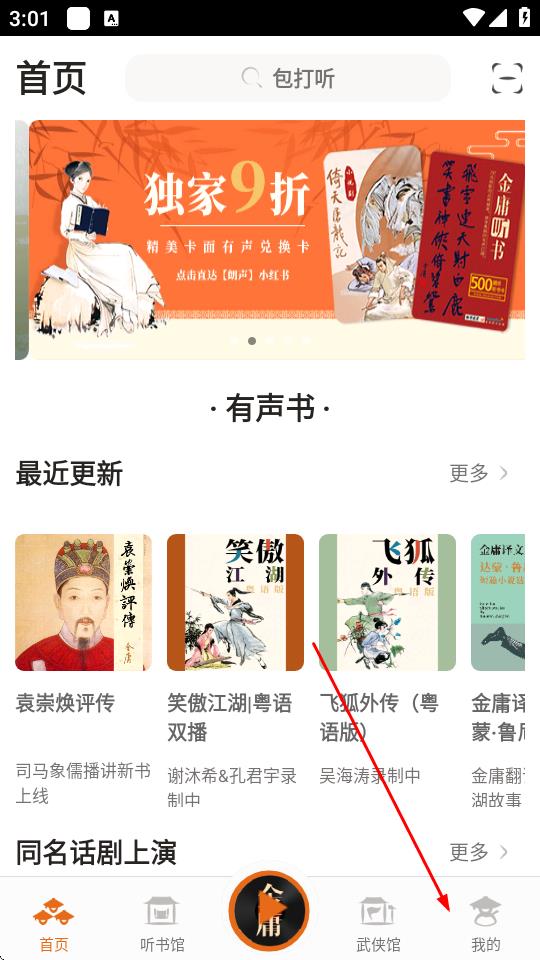 1、打开金庸听书APP,点击底部导航栏中的我的。