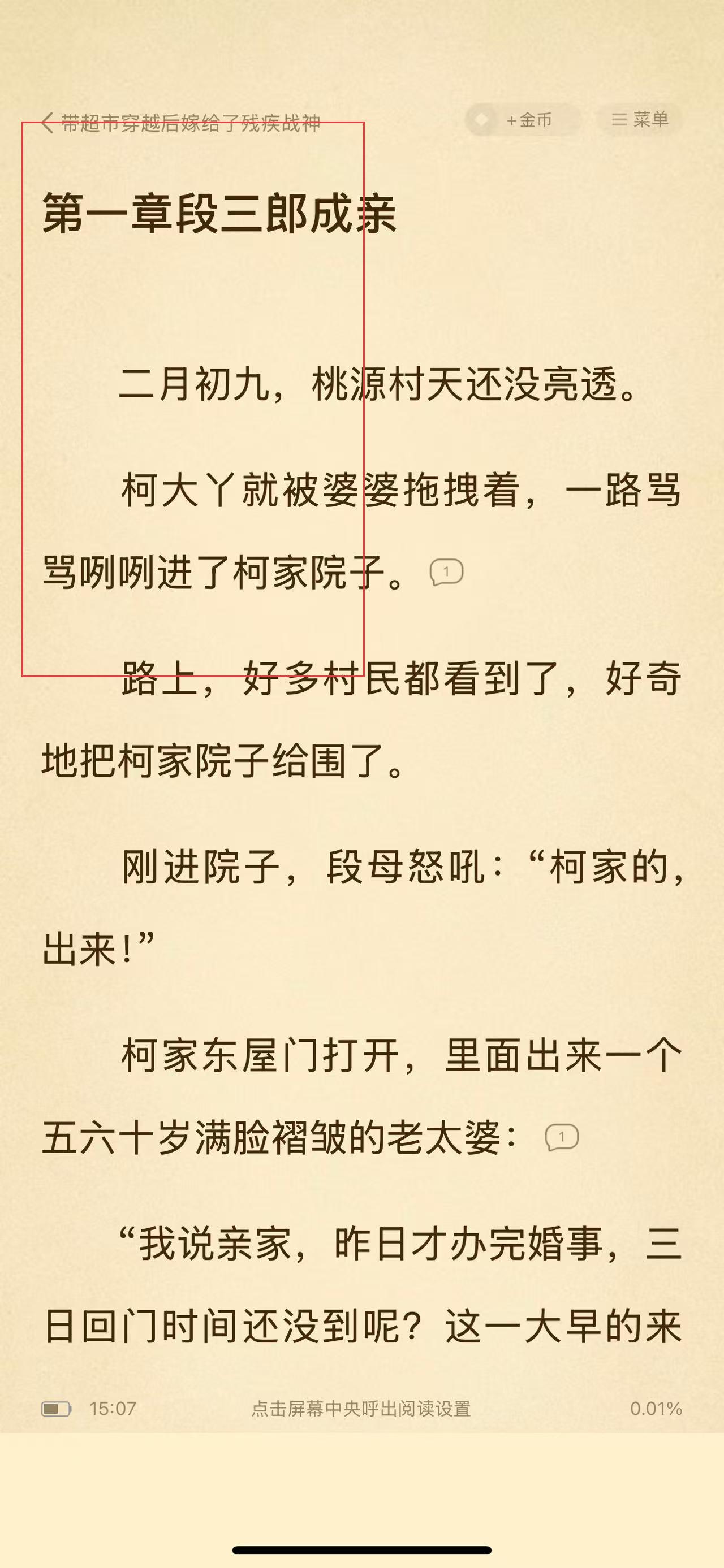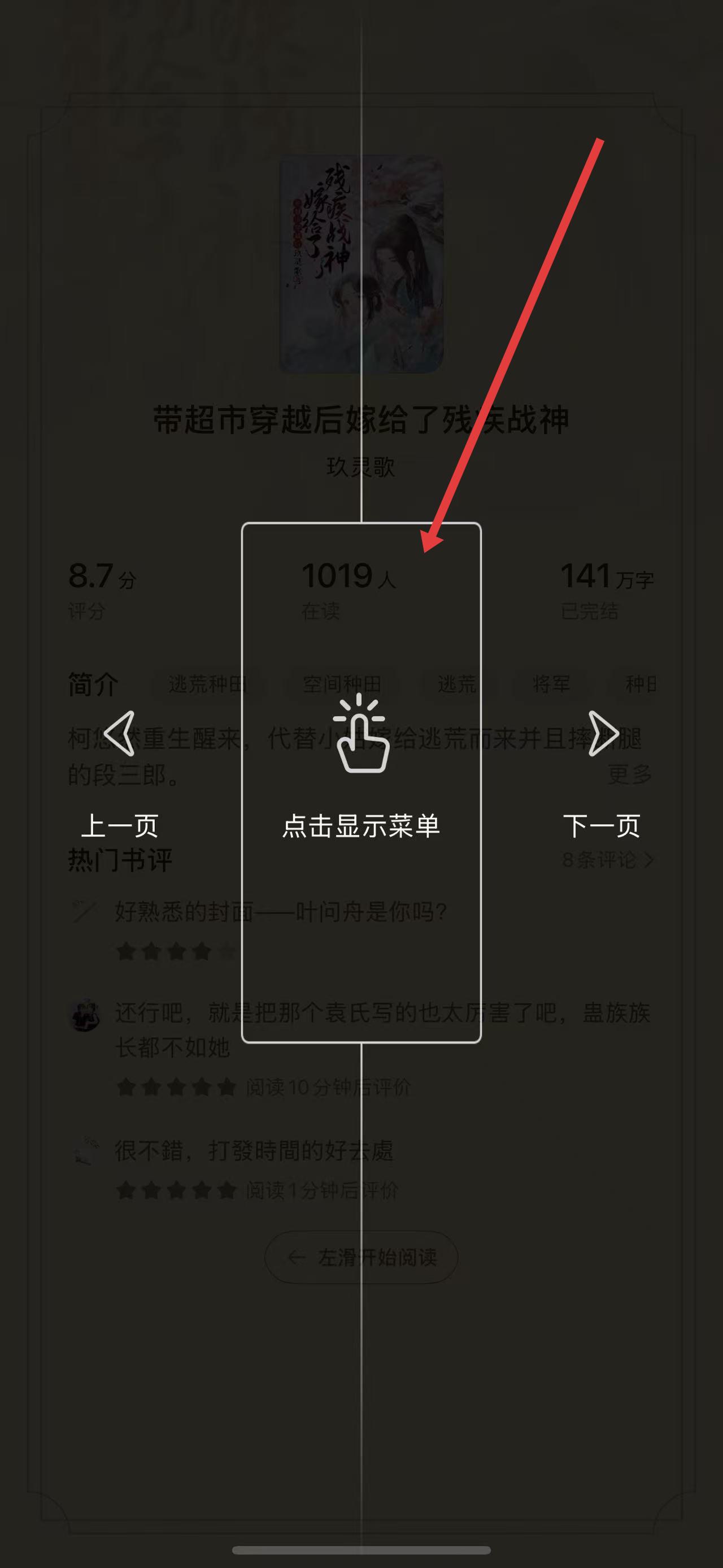 2、在小说详情页中,点击屏幕中间位置,出现点击显示菜单提示,再次点击调出阅读操作菜单 。