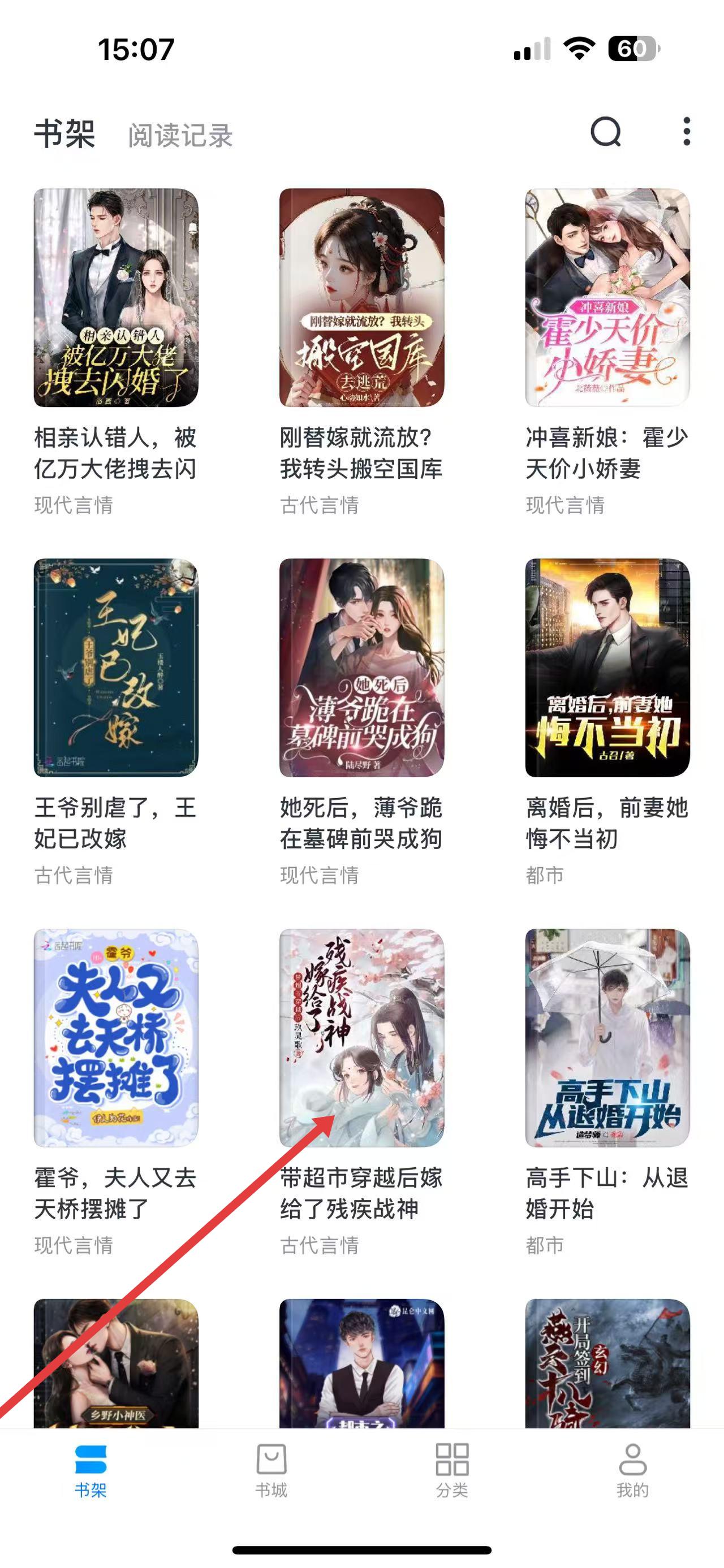 1、打开淘淘小说APP,进入书架界面,点击想阅读的小说封面,如带超市穿越后嫁给了残疾战神 。