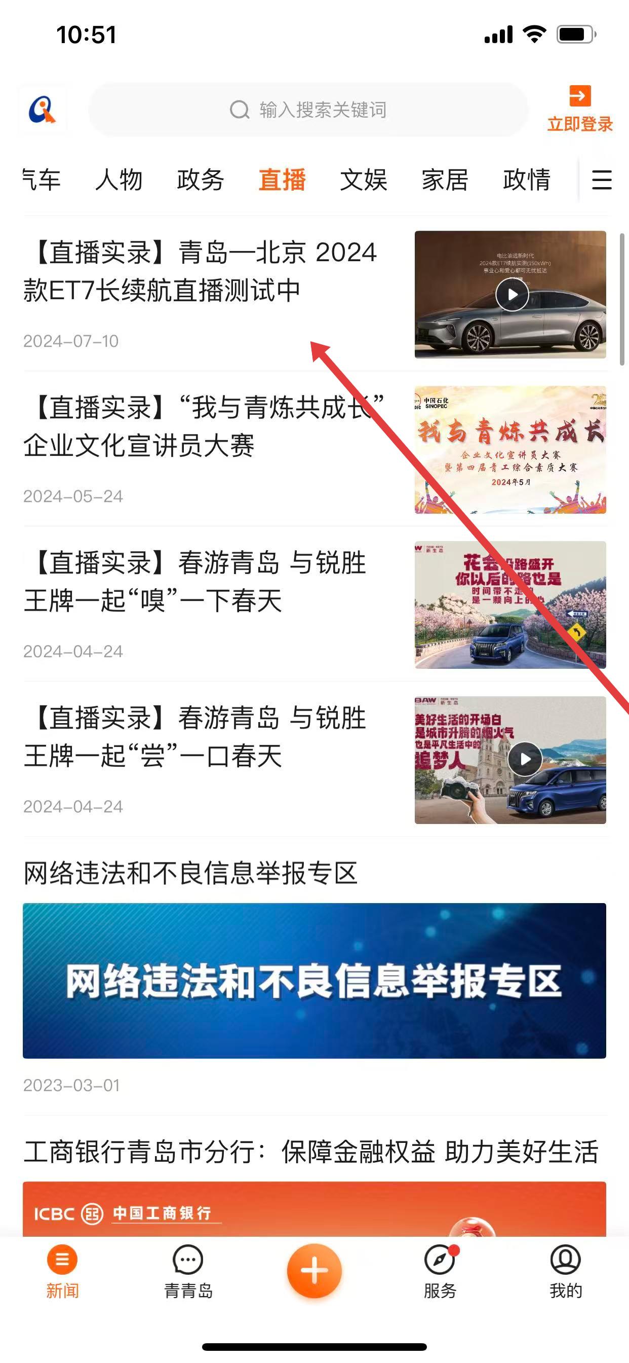 1、打开青岛新闻App,点击首页上方导航栏中直播选项。