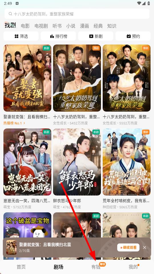 1、打开红果短剧应用,点击底部导航栏中的有钱选项。