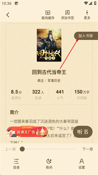 3、在阅读页面,点击加入书架按钮,可将该书添加到书架。