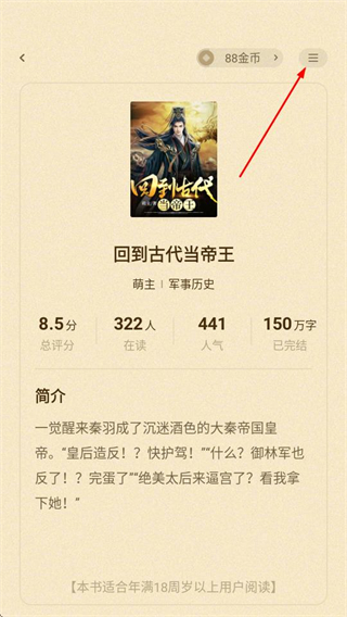 2、在书籍详情页,点击右上角的菜单按钮,进入书籍阅读页面。