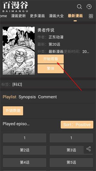 3、在勇者传说的详情页面,点击开始观看按钮,进入该漫画的阅读界面。