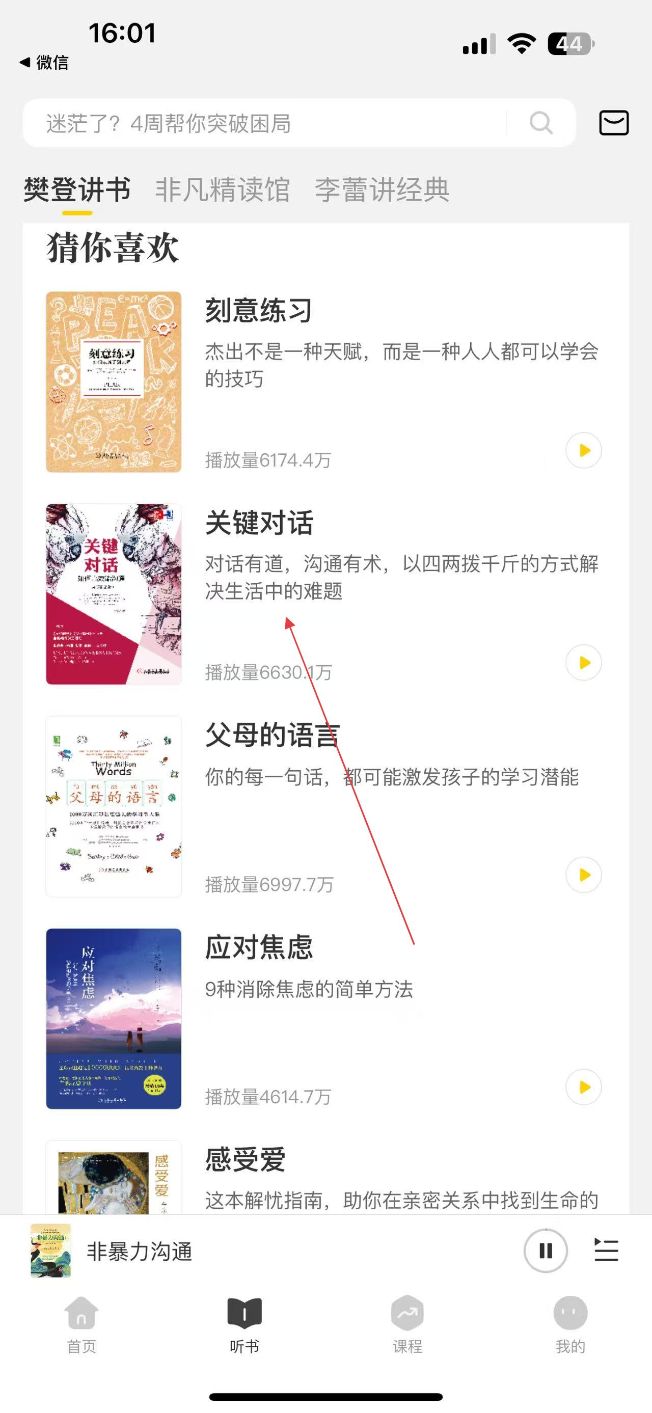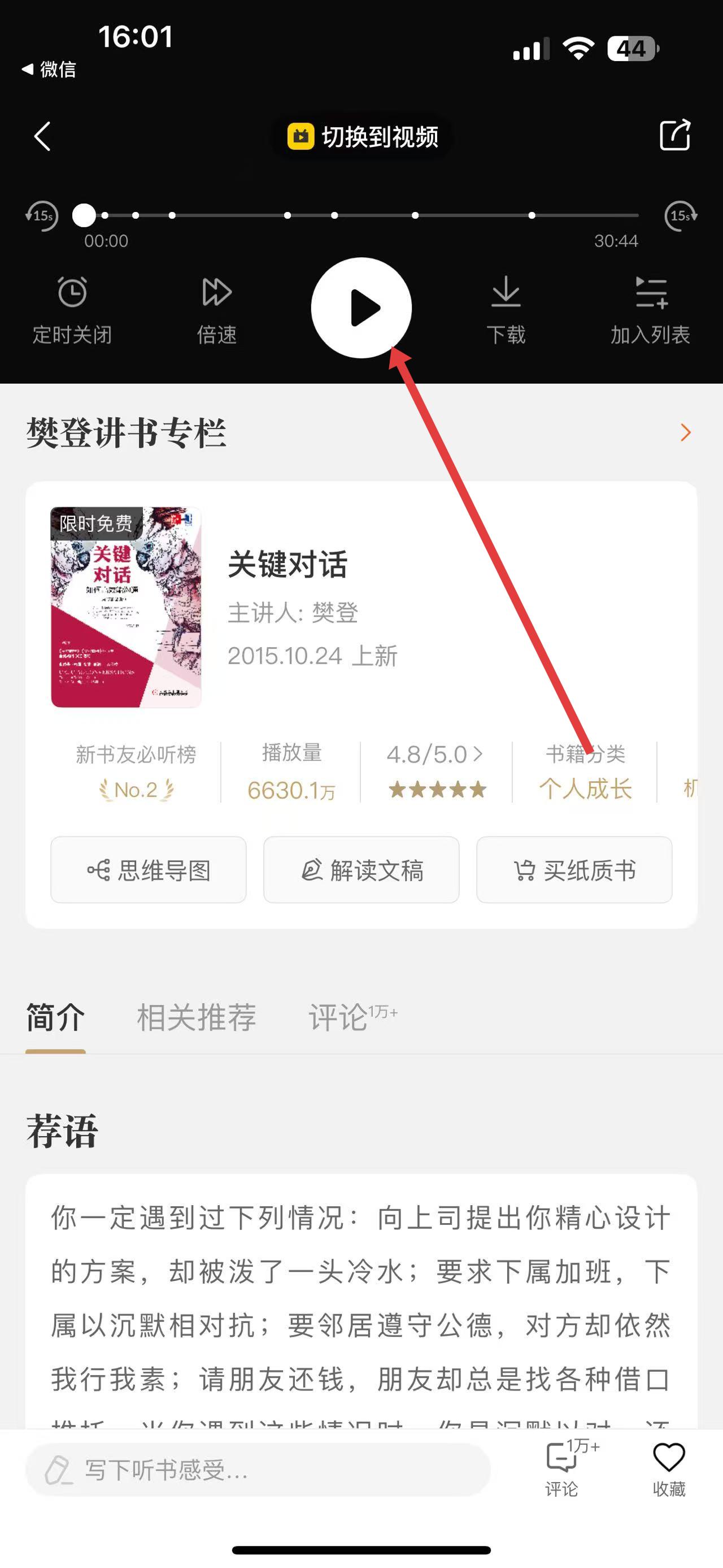 3、点击想免费听的书籍如关键对话,进入书籍详情页,再点击播放按钮即可免费收听。