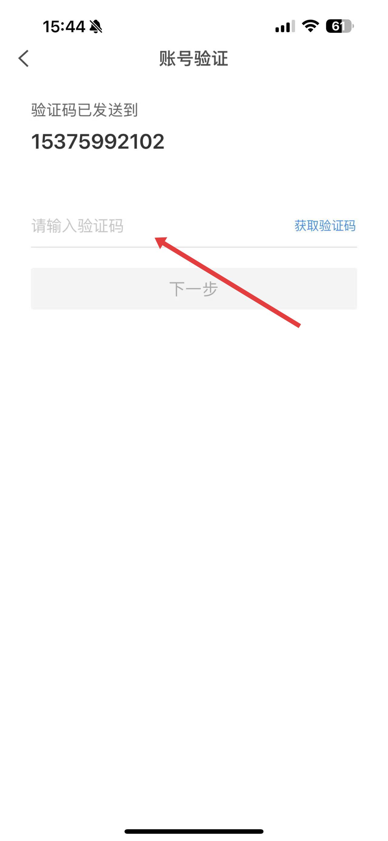 3、在账号验证页面,输入收到的验证码。