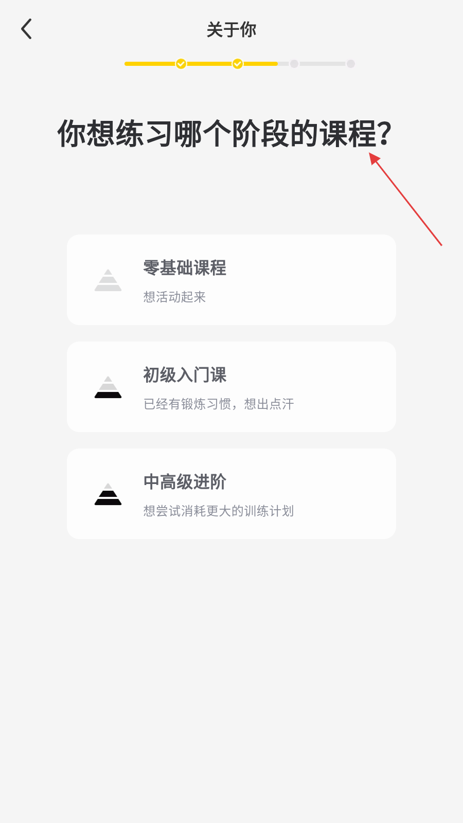2、根据页面提示选择想练习的课程阶段,点击对应选项继续下一流程。