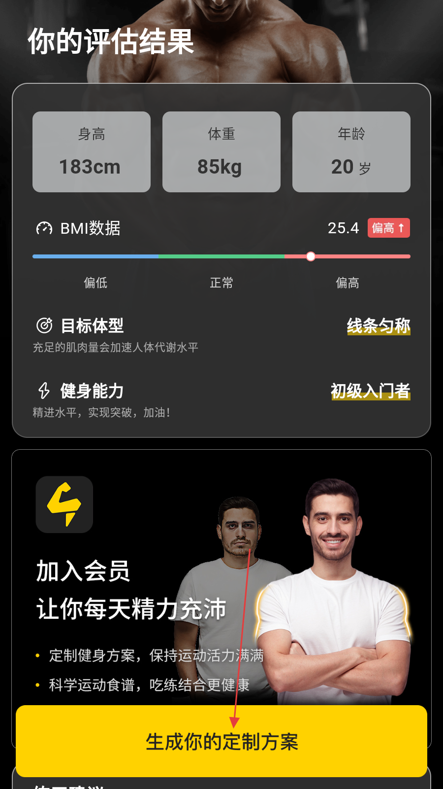 4、在你的评估结果页面,点击生成你的定制方案,获取专属健身计划。