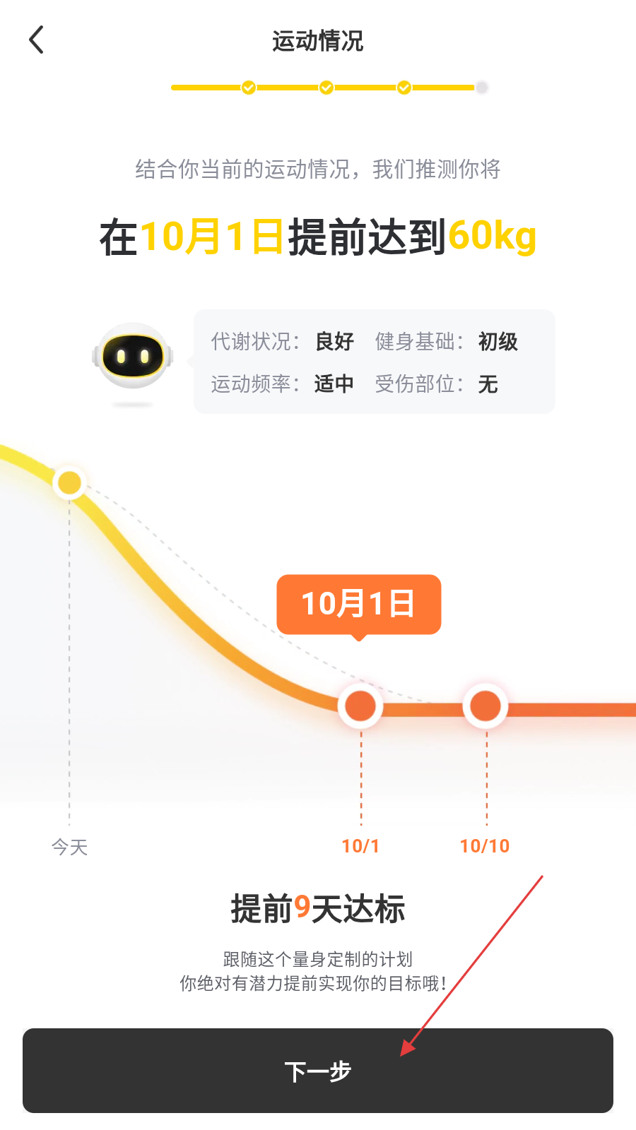 3、查看系统结合运动情况生成的目标达成预测,点击下一步。