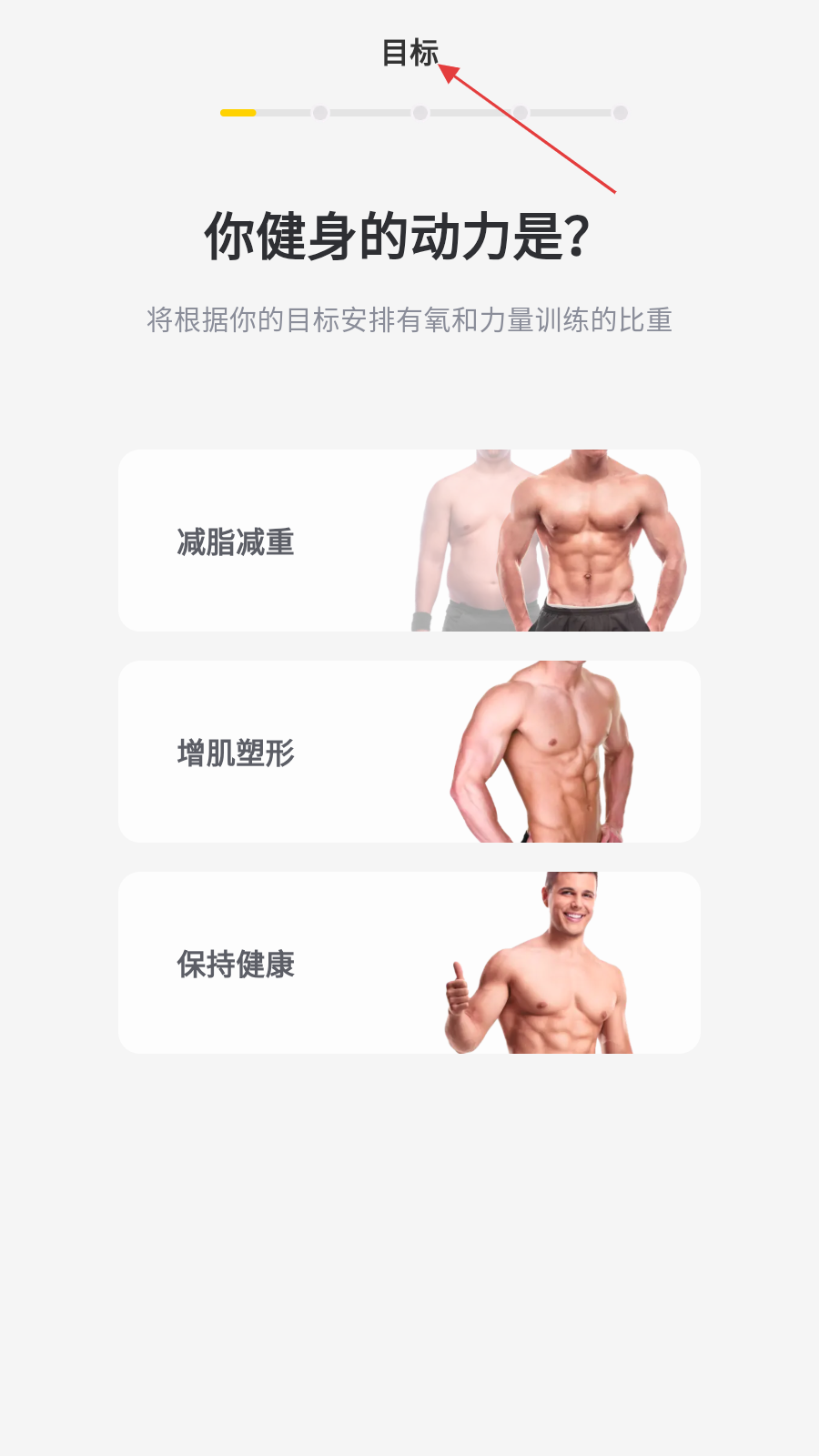 1、打开硬汗健身APP,首先选择健身目标,点击对应选项进入下一流程。