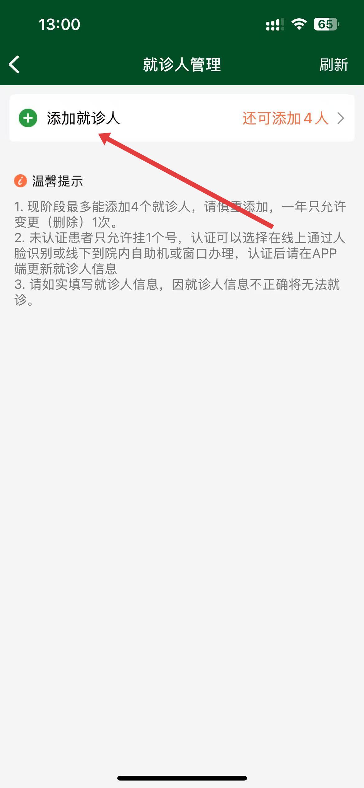 3、在就诊人管理页面,点击添加就诊人按钮。