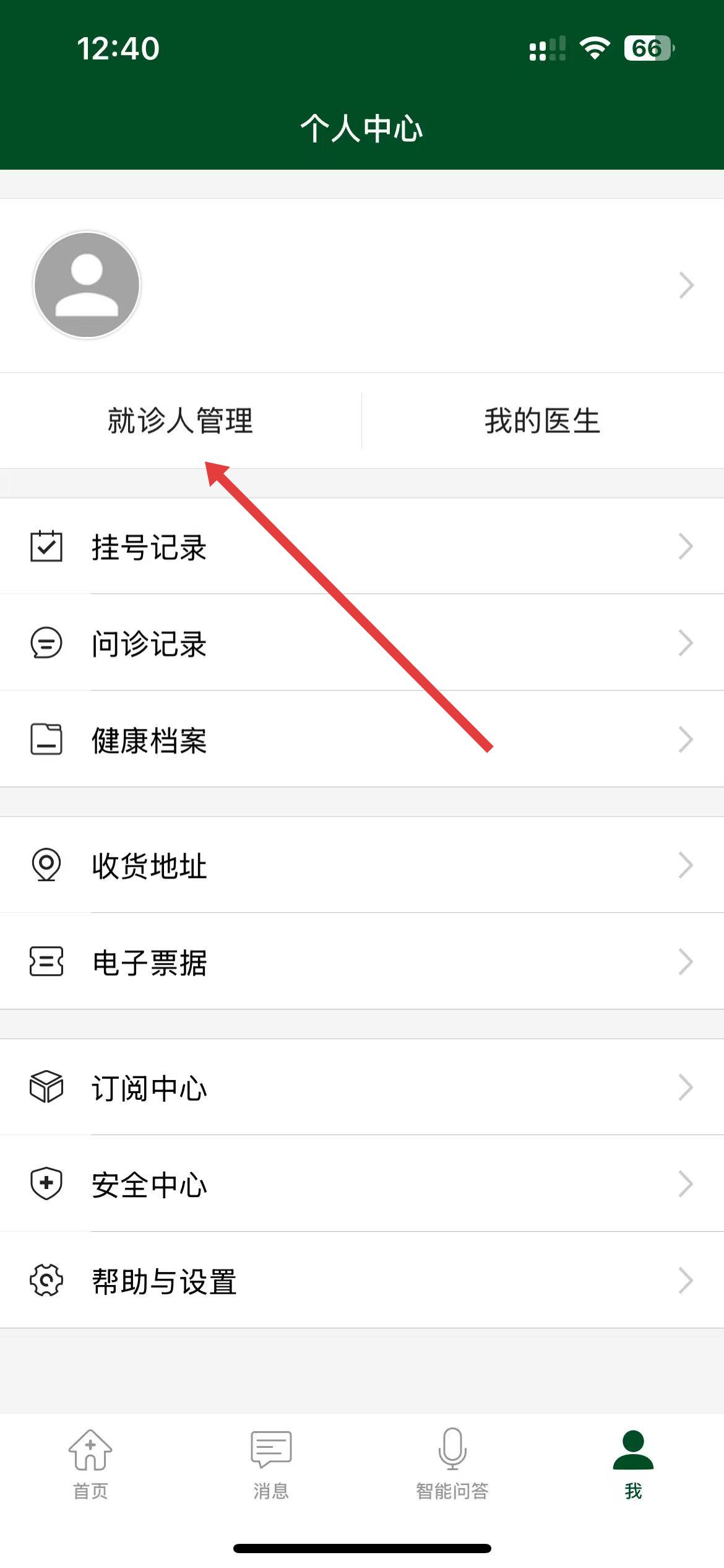 2、在界面中找到就诊人管理选项并点击进入。