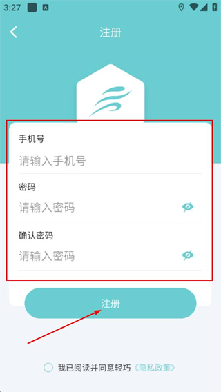 2、在注册界面输入手机号、密码、确认密码,点击注册。