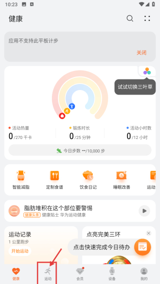 1、打开健康类APP,点击底部运动选项,进入运动页面。