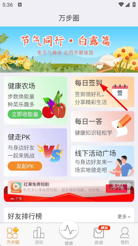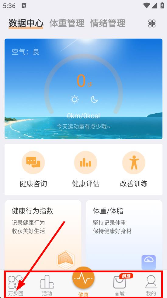 1、在健康页面,点击底部万步圈,进入万步圈页面。