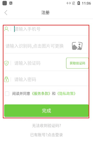 3、填写手机号、识别码、验证码,设置密码并勾选协议,点击完成。