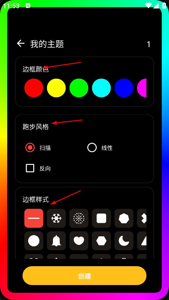 2、在编辑界面,按需挑选边框颜色、确定跑步风格(如扫描)、选定边框样式,完成后点击“创建”,生成自定义主题。