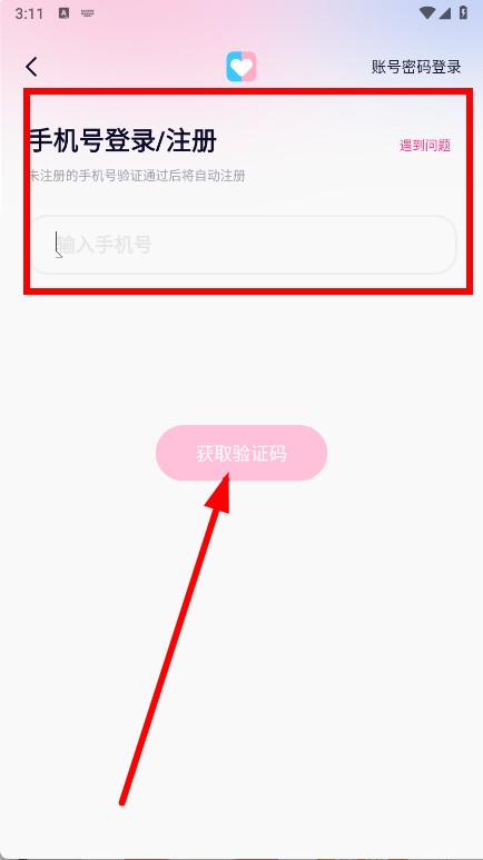 3、在手机号登录注册页面,输入手机号,然后点击获取验证码。