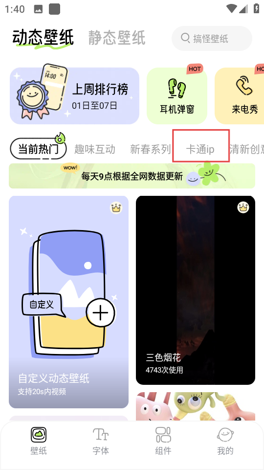 1、在动态壁纸页面,点击卡通ip,进入卡通ip类动态壁纸列表页面。