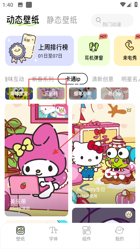 2、在卡通ip类动态壁纸列表页面,选择三丽鸥相关壁纸,进入该壁纸详情页面。